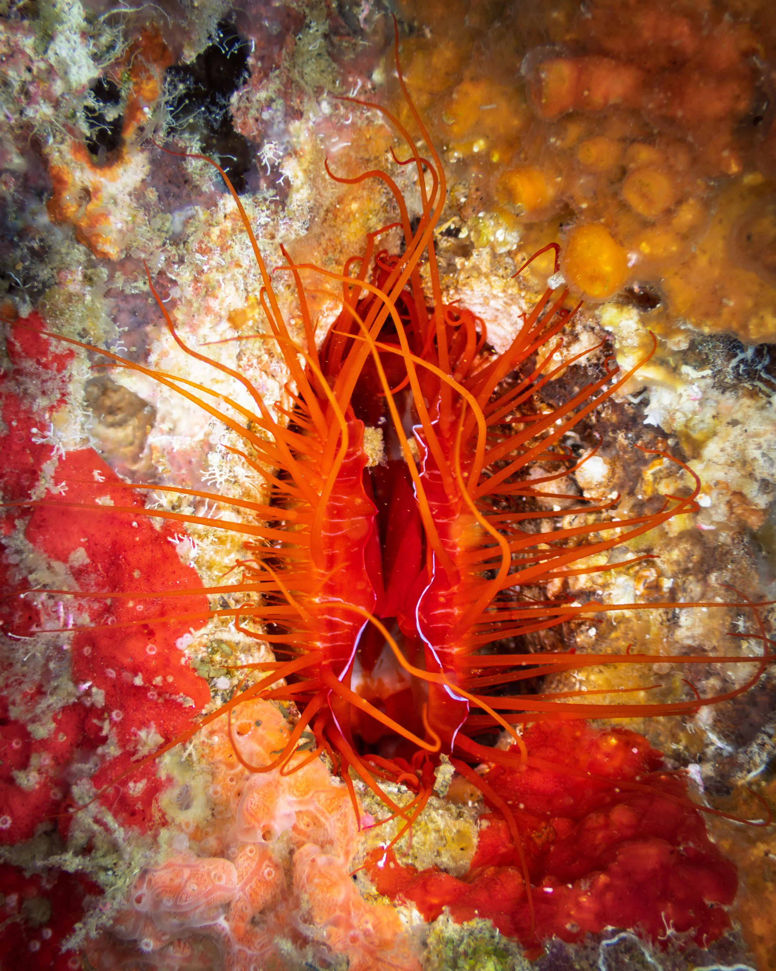 Close-up of two Christmas tree worms in vibrant colors, with one red and one blue, embedded in coral reef.