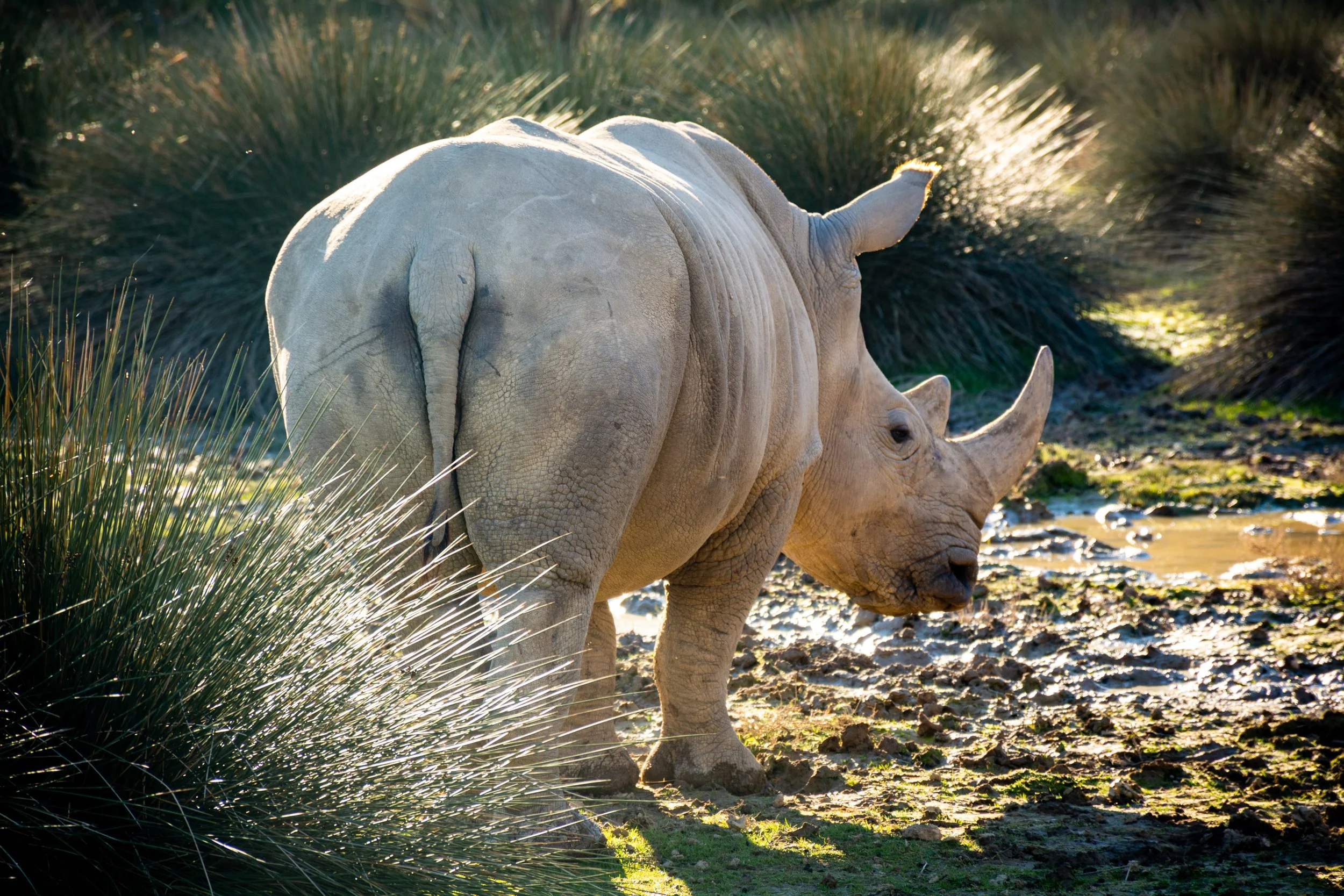 A rhinoceros standing in a muddy, grassy area surrounded by tall grass. View fullsize
