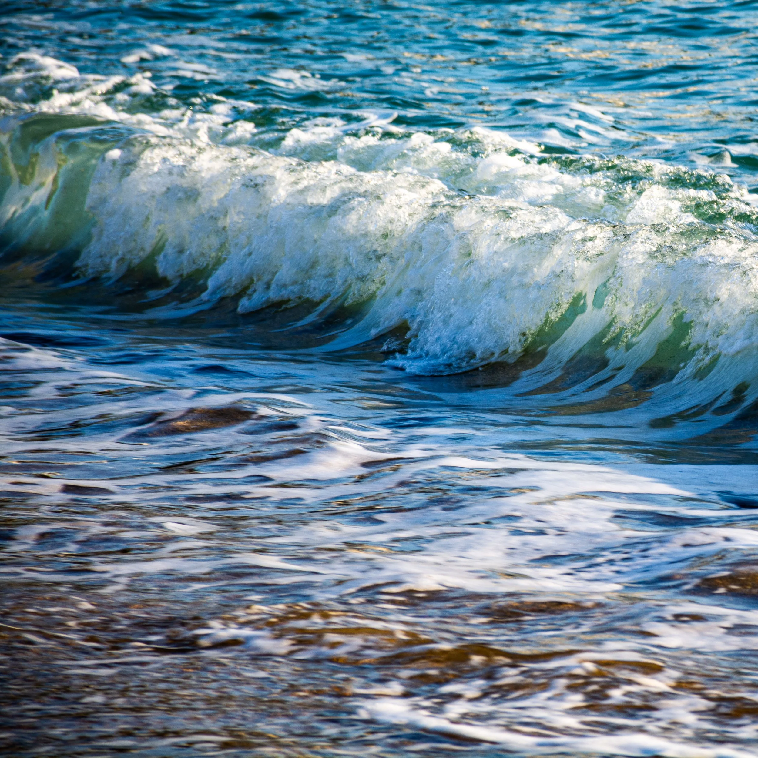 Footprints and rocks on a sandy beach with ocean waves approaching. View fullsize