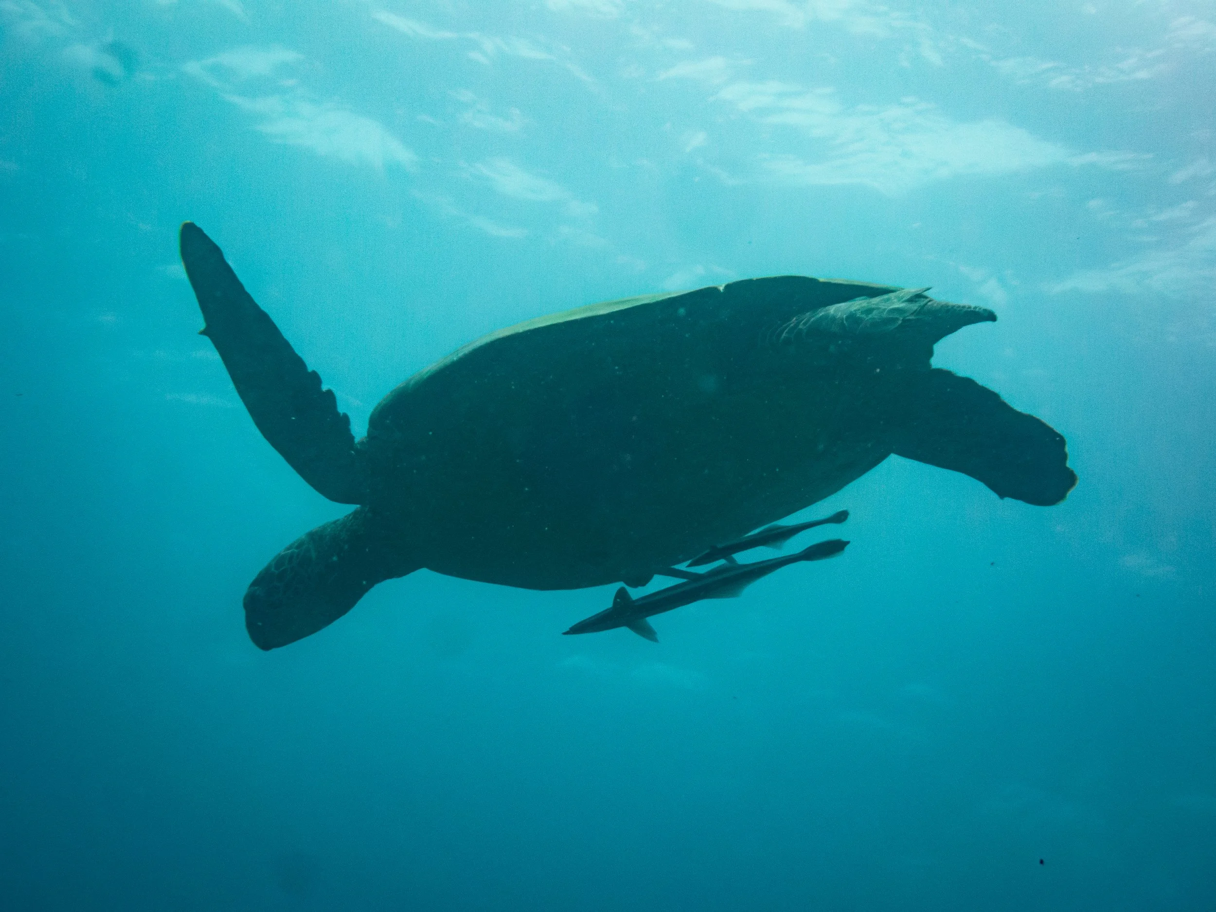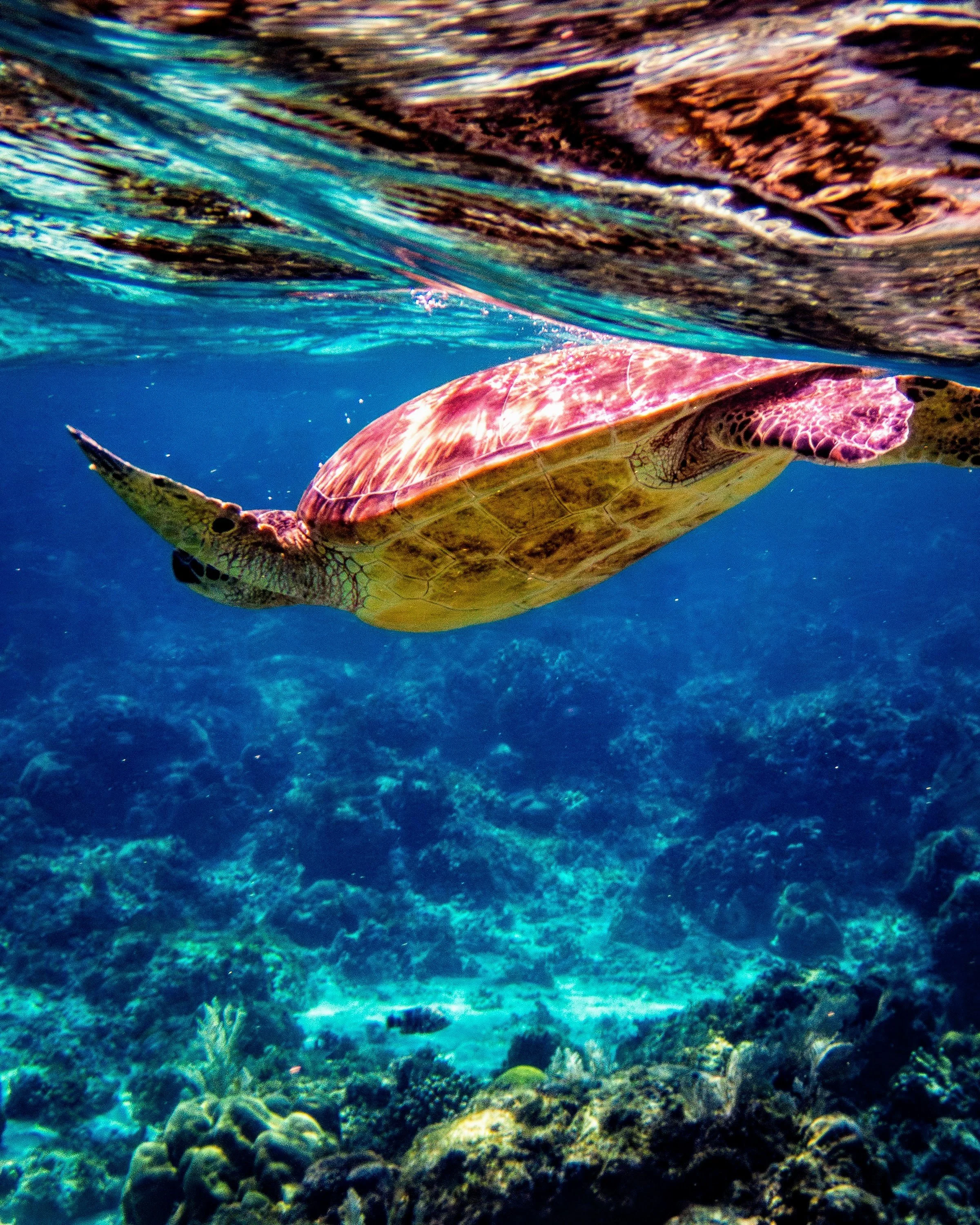 Sea turtle swimming underwater, view from behind, in blue ocean.