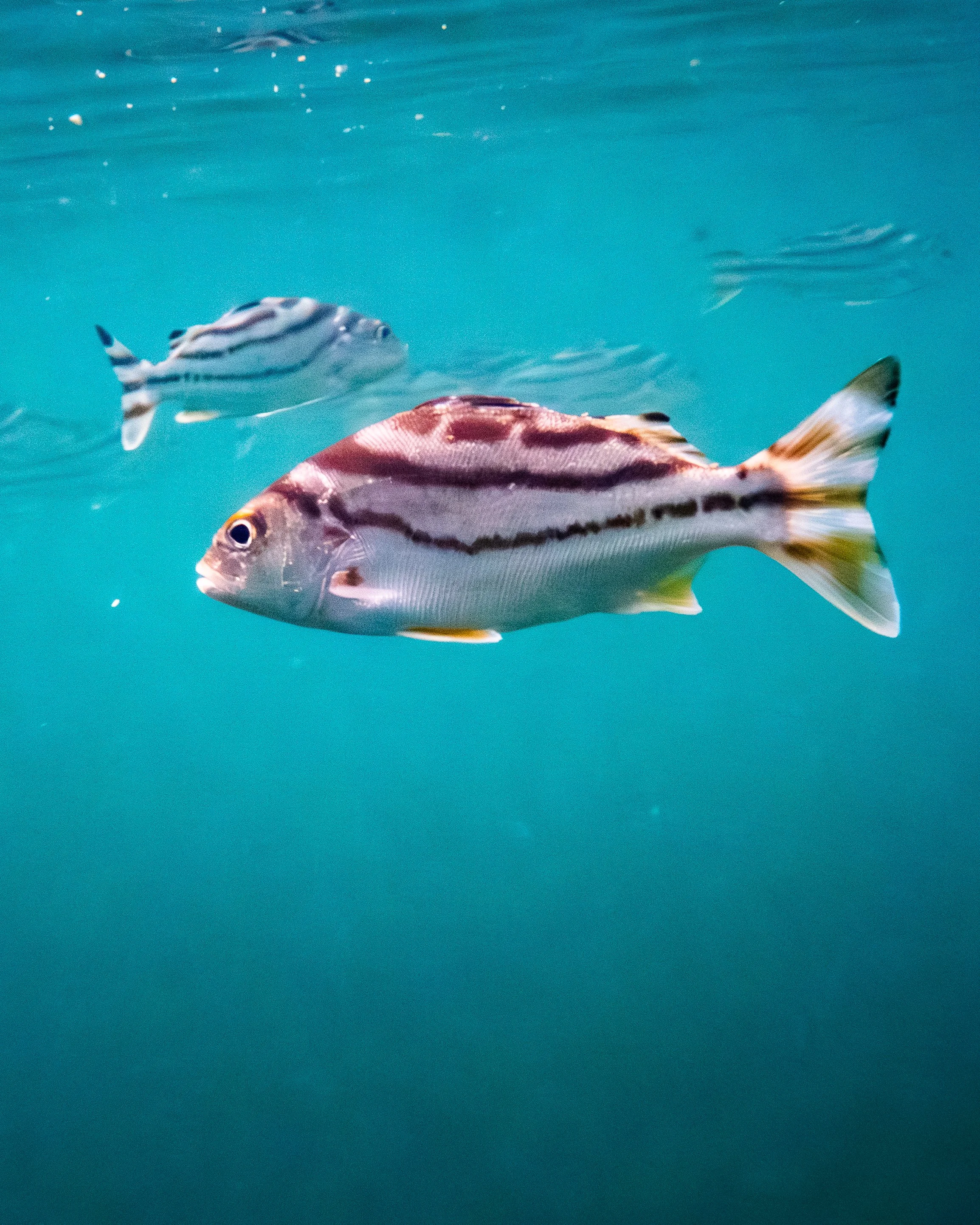 Underwater view of striped fish swimming in clear blue water. View fullsize