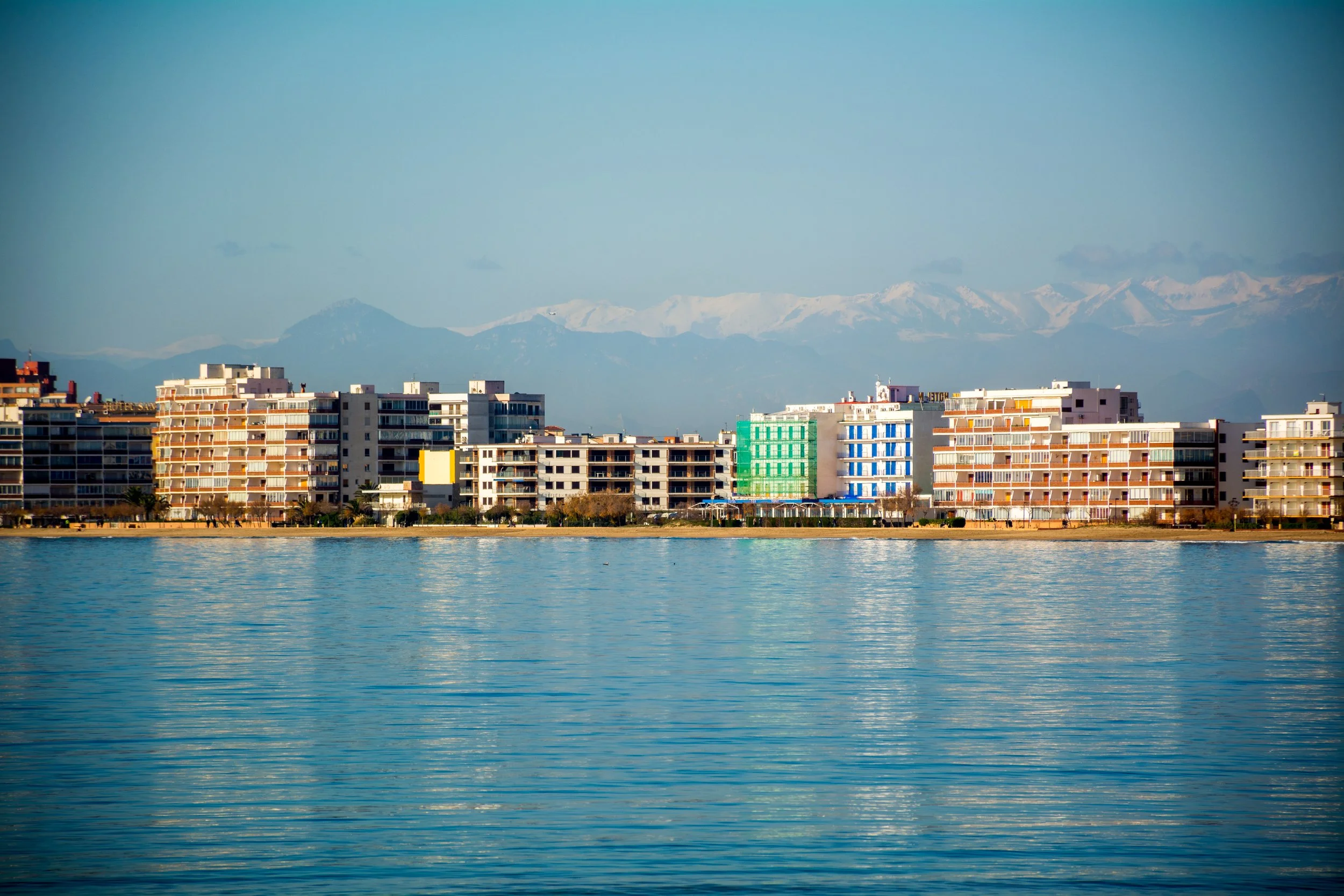 Coastal cityscape with modern apartment buildings, mountains in background, and calm sea in foreground.
