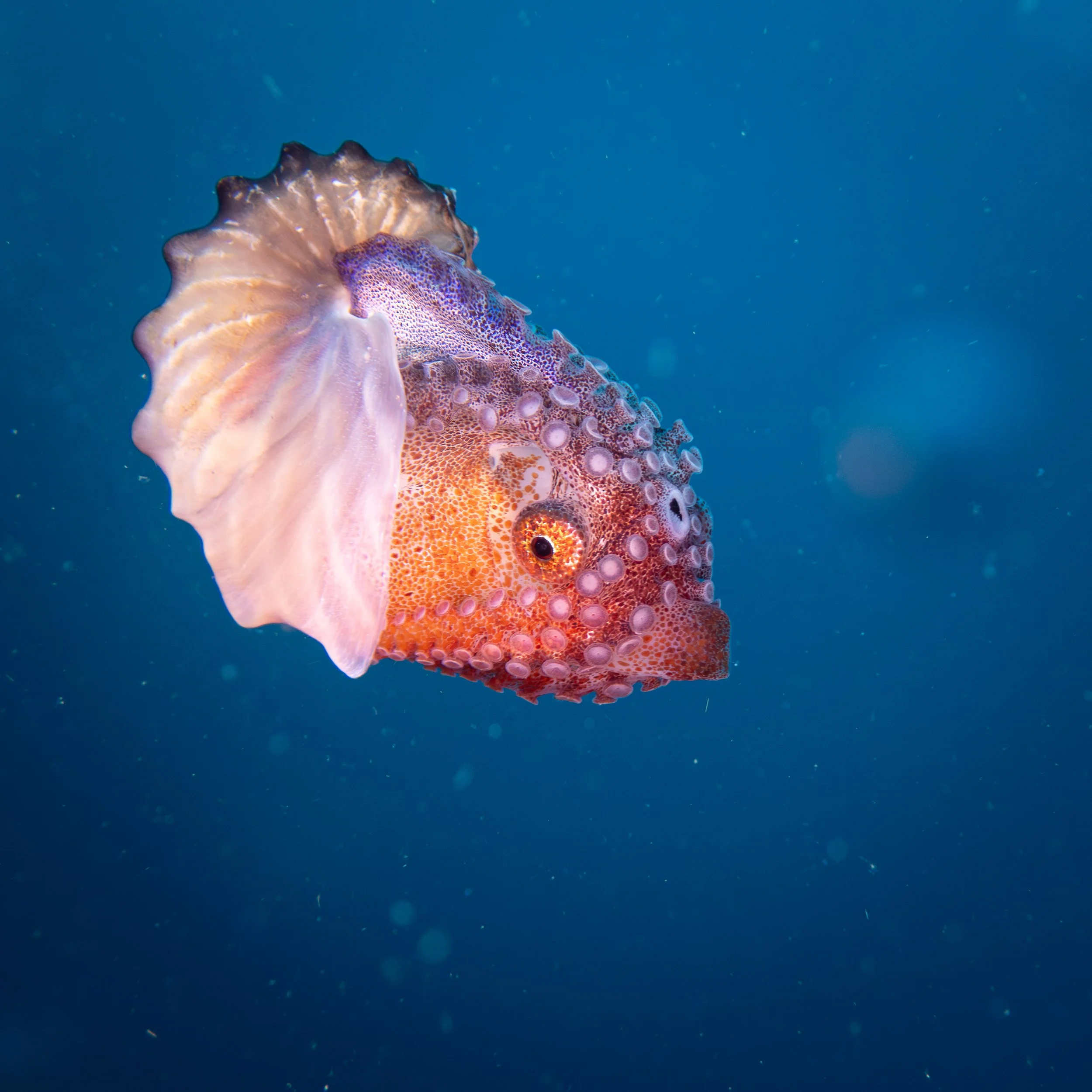 A white frogfish camouflaged against a sea sponge underwater. View fullsize