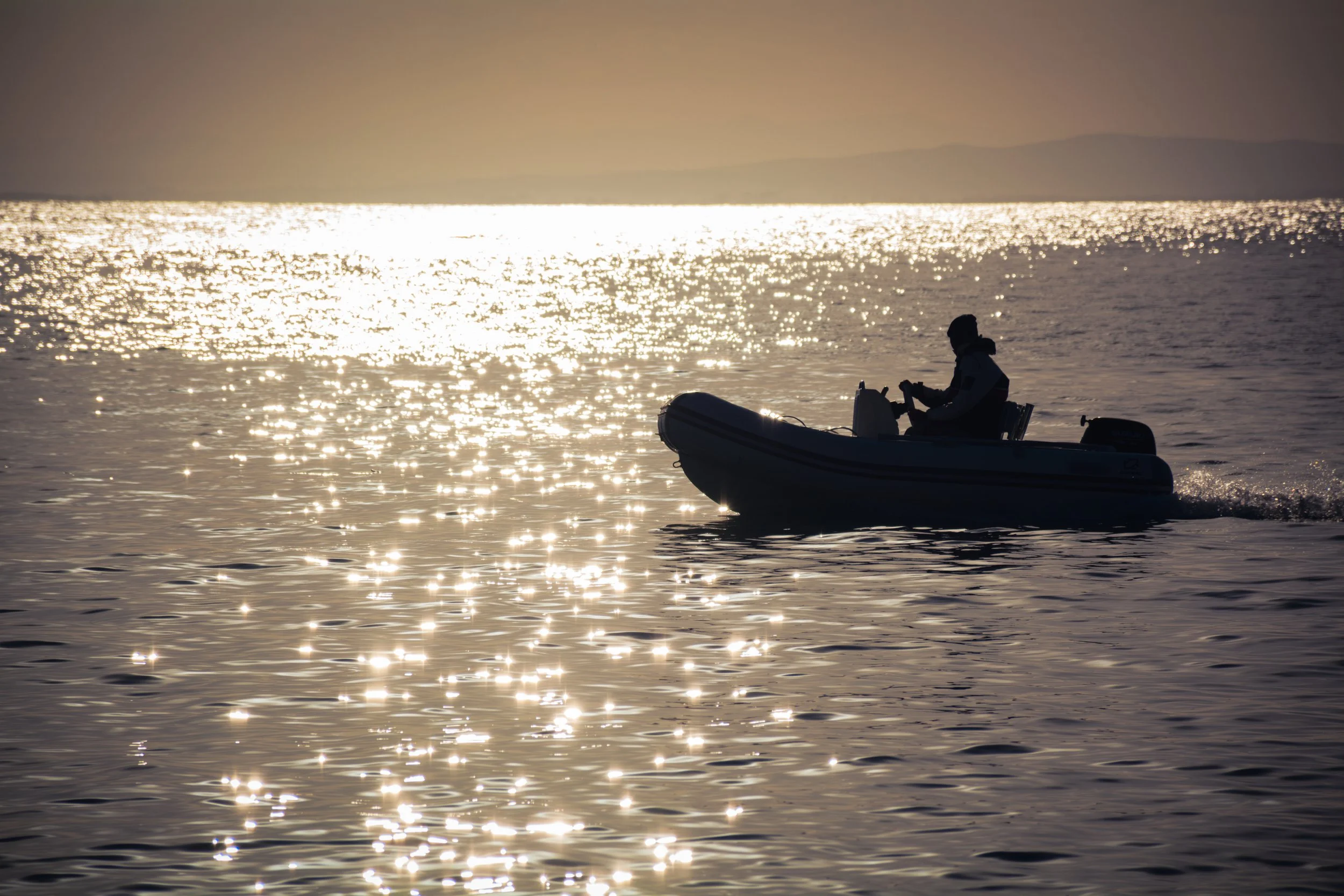 Silhouette of person in a motorboat on a sparkling sea at sunset.